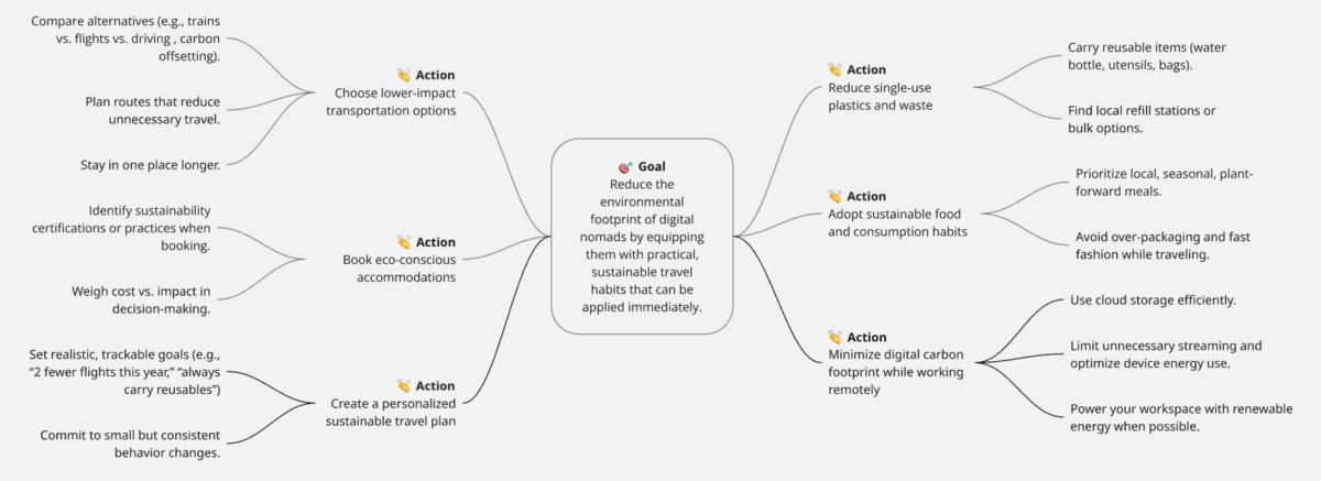 In order to identify high-priority actions I began by determining the main goals of the training which is "Reduce the environmental footprint of digital nomads by equipping them with practical, sustainable travel habits that can be applied immediately." I then determined, from my research, the most important actions that need to be taken by learners in order to complete this goal. This include things like choosing lower-impact transportation options, booking eco-conscious accommodations, and minimizing digital carbon footprint while working remotely.